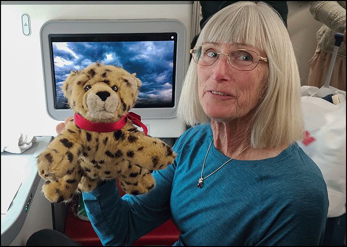 frequent-flier miles to upgrade to Cloud Nine business class made the flight a pleasure instead of an ordeal, with excellent food and seats that could fold down flat into beds. The rest of our group was traveling in similar comfort on a United flight from Newark. My little stuffed cheetah Duma, my safari mascot, rode safely in my carry‑on this time. After he went missing with my suitcase for several days on the last trip, I wasn’t taking any chances.