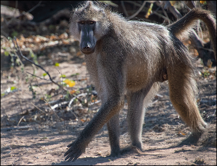 A group of baboons came sauntering down the road, full of their usual arrogant attitude. One big male sat down cross‑legged by the track, rummaging through elephant dung with great seriousness, while another gave us a disdainful look over his shoulder as he strolled past. Baboons are athletic and surprisingly graceful when they move, but it’s hard not to be distracted by their ugly bald butts and condescending expressions. They always look as if they’re judging your life choices, and finding you wanting.