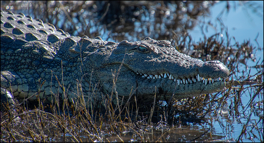 A large crocodile lay sunning himself on the bank; his jagged teeth showed in his sinister serpentine smile. Several hippos lay half-submerged in the shallows, snorting at us as we glided by. Soon we saw more crocodiles; there was one enormous old male about fifty years old - our river guide told us they can live to be a hundred.