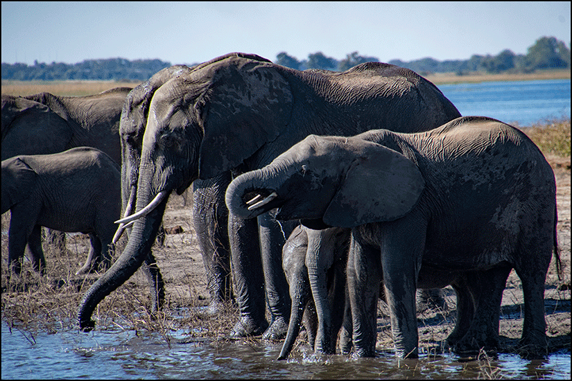 We drifted near the shore and watched a small herd of elephants at the water’s edge. A mother with a young calf stood drinking; the baby was hard to see, nearly shielded from view by the adults who surrounded and protected him.