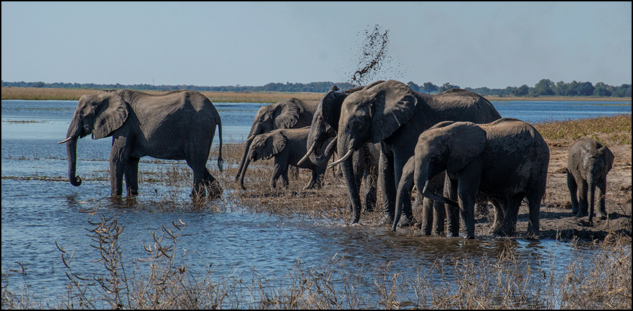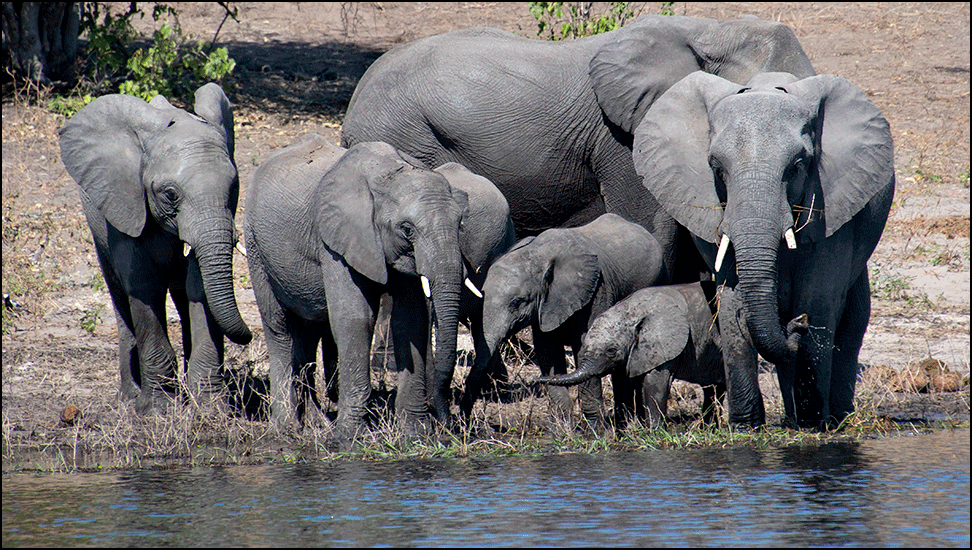 More elephants appeared up on the ridge to our left, not far from the road. They were silhouetted against the blue sky as they browsed with slow, deliberate movements. Before long they came down off the ridge to drink at the river. Looking across the river, we could see a long single‑file line of elephants making their way along a narrow spit of land out in the river as they made their way toward Namibia. So many elephants.