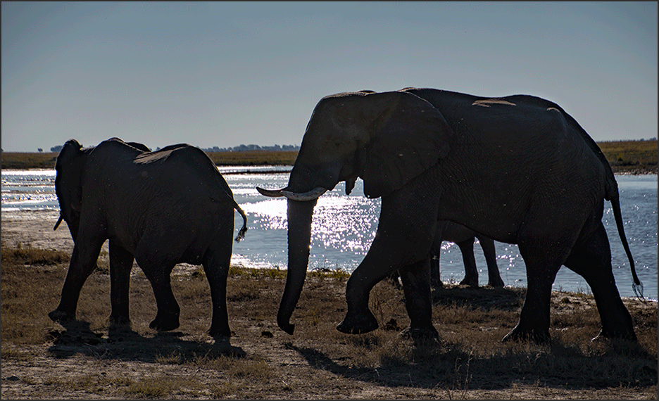 We went back down to the river; there were elephants everywhere. A long procession of them waded across the wide expanse of the Chobe River. It was a beautiful scene: elephants and giraffes were scattered along the riverbank, silhouetted against the fading afternoon light. One big elephant was wading through a deeper channel, only the top of his head and back visible above the water. Ihaha is known for having a lot of elephants, and it was certainly living up to this reputation.