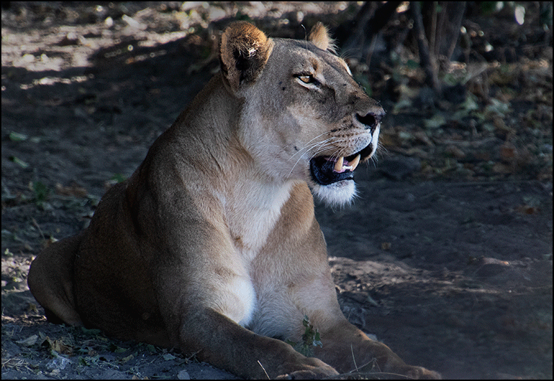 The lioness lay in the shade, head up, watching us as we eased closer. After a moment she yawned extravagantly, as if to show us how unimpressed she was, and then bared her teeth briefly before settling back into a light doze. The youngsters were tucked away in the bushes, though we caught an occasional glimpse of movement. Gee had heard that the rest of her pride was nearby as well.
