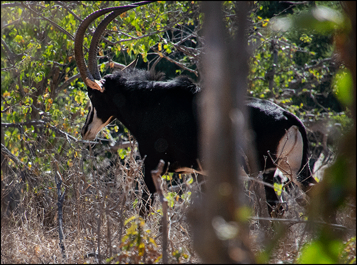We drove on, back up the hill. To our delight, we came across a herd of sables - eight or ten of them, with babies. They are large handsome antelopes, dark brown or black, with white bellies and face markings, and long backward-curving horns. I had only ever seen a sable once before, also in Chobe with Gee, on our first trip together ten years ago, and that had been just a quick glimpse of one dashing across the road. This time we were lucky enough to watch them moving slowly through the trees. To see them at all is rare - to see them on our very first day was amazing.