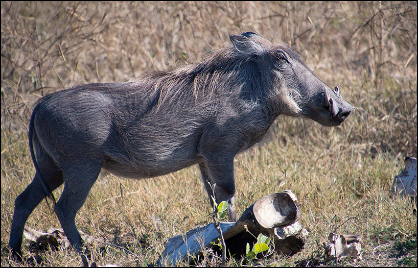 pair of warthogs rummaged among some old bones. Warthogs are