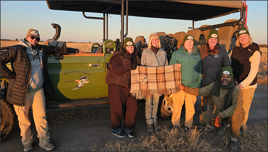 For those of us who had been on multiple safaris with Gee before, it was so great to see him. We all count him as a good friend, and being back in Botswana with Gee felt like coming home. We gave him some gifts we had brought. Natalie and Paula had gotten some lovely merch made with the Makomkom logo; they had brought shirts and blankets for Gee and the guys, and hats for all of us. Jineen and I, along with our friend Janell who had been on the last trip, had gotten him a new camera and lens – his old one had finally given up on the previous safari.