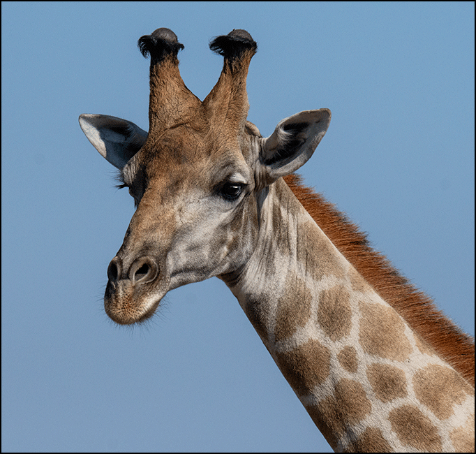 large male wandered over to join them. They were close enough for us to see the fine details – big gentle eyes with luxurious long eyelashes, dark dexterous tongues, and their knobby round-topped horns called ossicones. Gee told us that female giraffes have hair on the top of these knobs, while males don’t because they wear the hair off when they fight.