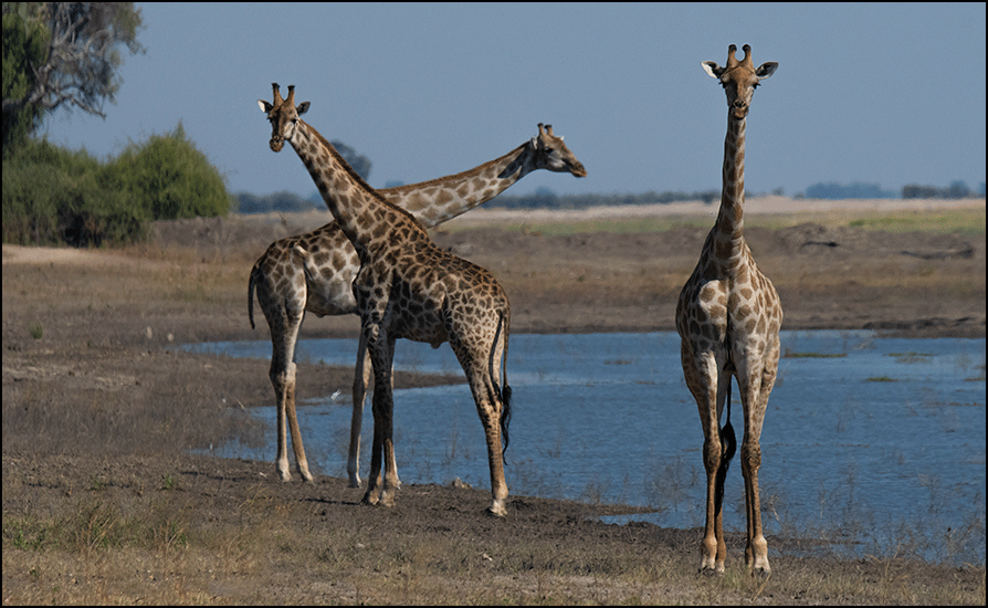 The giraffes moved elegantly back and forth along the river’s edge, all gracefully arched necks and long, slow strides. After a few minutes they paused, standing alert and scanning the area for predators. Once they were satisfied it was safe, they took turns having a drink.