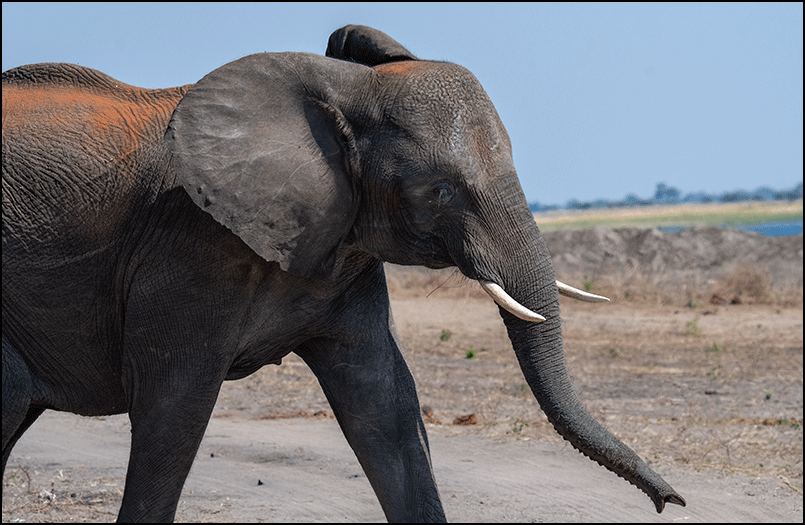 Several elephants crossed the track in front of us, heading toward the river to drink. Their backs were covered in a red, powdery dirt; they must have just finished a dust bath.