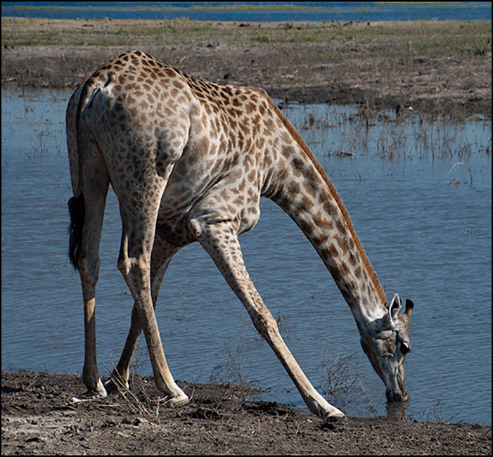 A giraffe drinking is always a bit of a production, and a wonderfully awkward, unforgettable sight. He spreads his front legs wide to ease himself closer to the ground, then lowers his long neck inch by inch until he finally reaches the water. Every few seconds he jerks his head up in alarm to check for danger - water flying from his muzzle - then repeats the whole routine. It’s amazing how an animal that looks so majestic standing up can look so completely uncoordinated just trying to get a drink. When he’s finished, he brings his legs back together in a quick, practiced move and stands tall again - instantly transformed from clumsy back to regal.