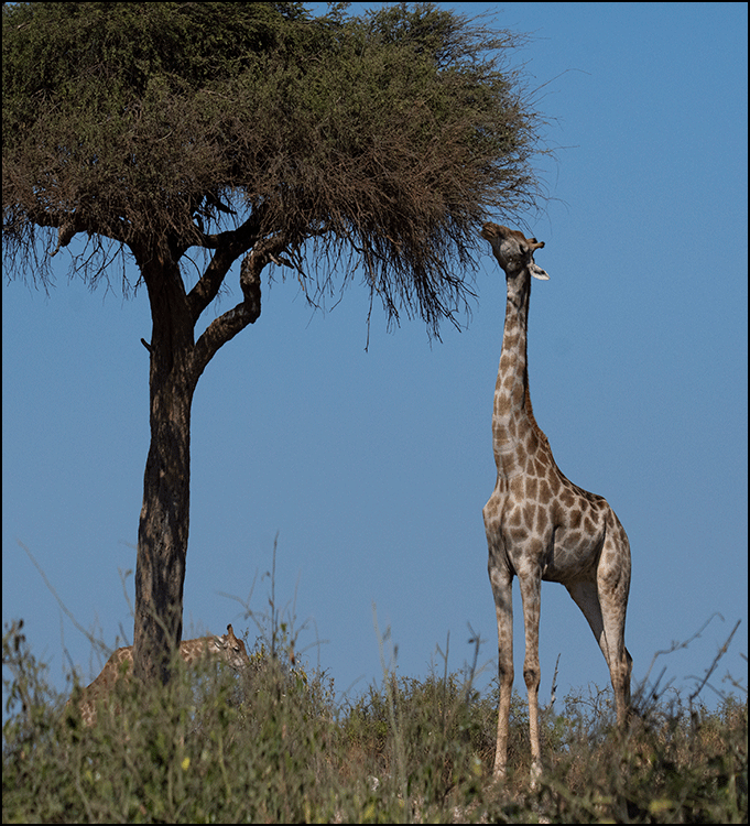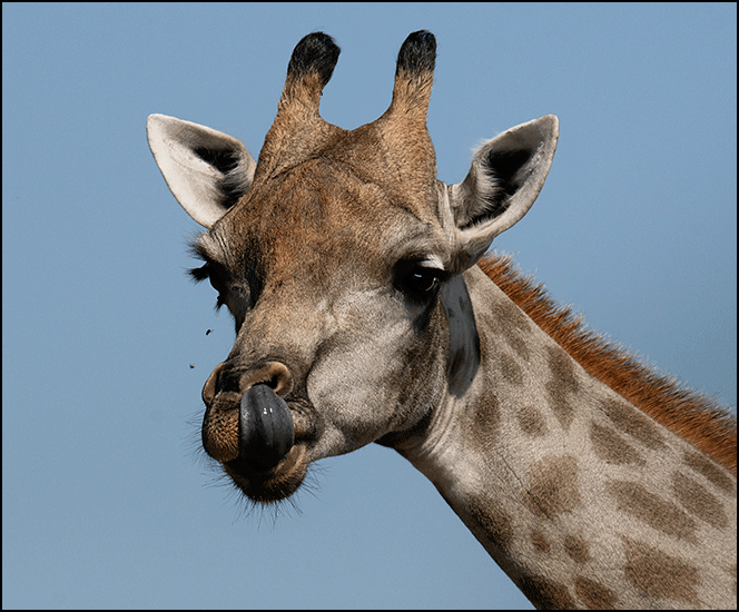 And don’t forget that long, dark purplish‑black tongue, which can extend far out of the giraffe’s mouth to curl around a branch and neatly pluck off the leaves while carefully avoiding the thorns. We watched this dexterous appendage at work, twisting and grasping with surprising precision.