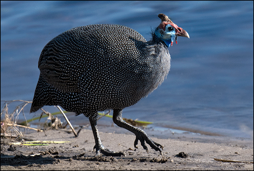 Along the river there were birds everywhere. Guineafowl strutted along the water’s edge, their blue and red heads and speckled bodies standing out against the deep blue of the river. A large flock of