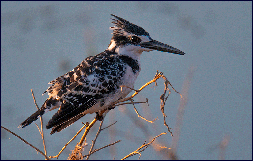 Then a flicker of movement caught Gee’s eye - he had spotted a pied kingfisher hovering over the river, its wings a rapid blur as it held itself suspended in midair like an oversized hummingbird. It hung there for several long moments, perfectly steady, before folding its wings and dropping straight down in a lightning‑fast vertical dive - a moment later it shot back up with a small fish glinting in its