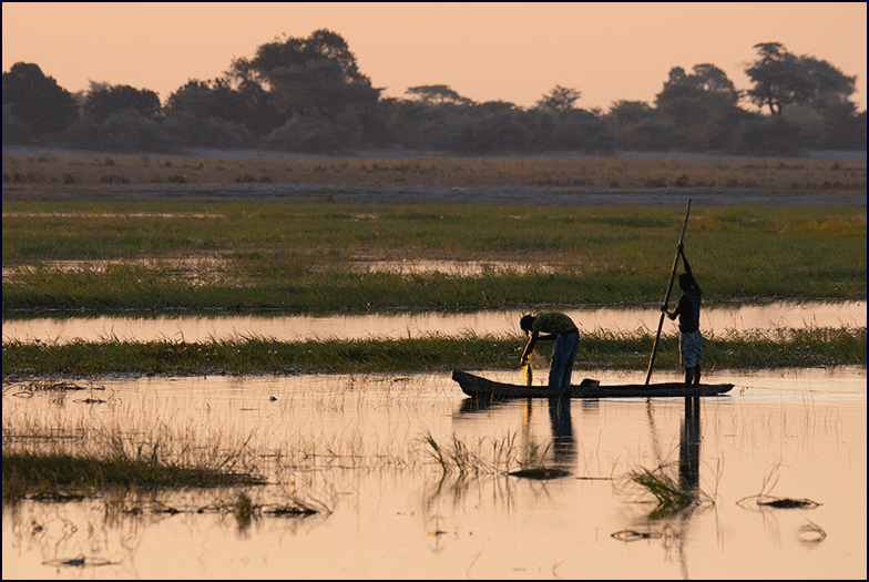 high-pitched cry of a fish eagle. Our two fisherman in the mokoro were back, poling themselves along the river, and we caught the brief gleam as they pulled in a silver fish.