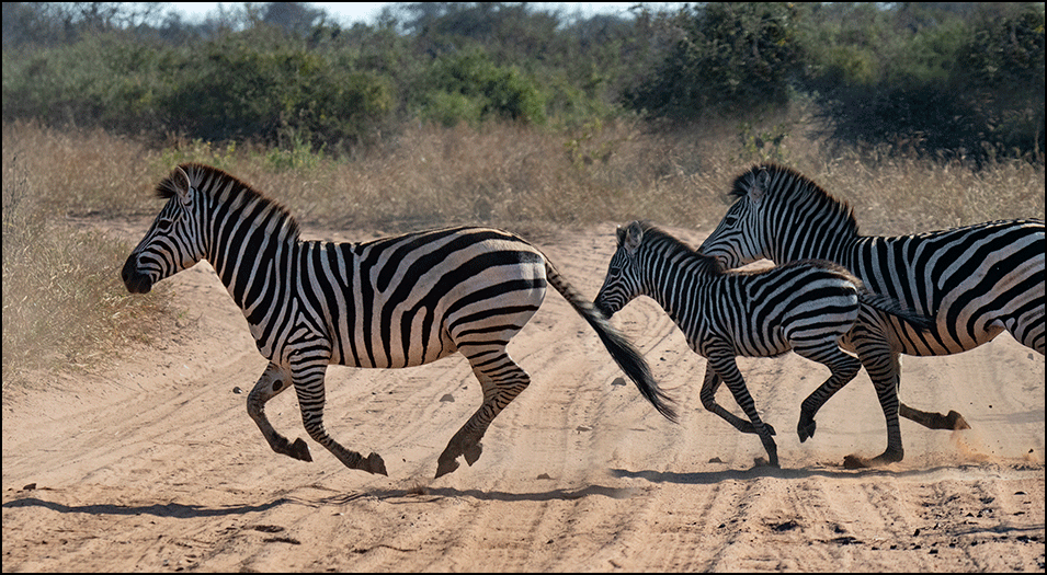 Suddenly we heard the sound of hoofbeats, and Gee paused the Land Cruiser. Half a dozen zebras burst across the road in front of us, clouds of dust rising as they thundered by. A couple of giraffes followed them, moving slowly, and then more zebras appeared. They dashed across in a neat line, quick and sure‑footed, while I fumbled to get my camera focused in time. Then they leaped up the small bank on the far side and disappeared into the brush. It was wonderful to see them in full motion, all energy and elegance at once.