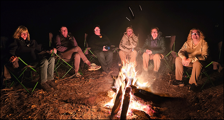 Back at camp, we settled into our usual rhythm: a double G&T or wine by the fire, with the flames crackling softly as the last light faded from the sky and the stars gathered above us. Our group shared a sense of quiet contentment as we all relaxed and unwound, swapping stories, comparing notes on the day, watching the sparks drift upward.