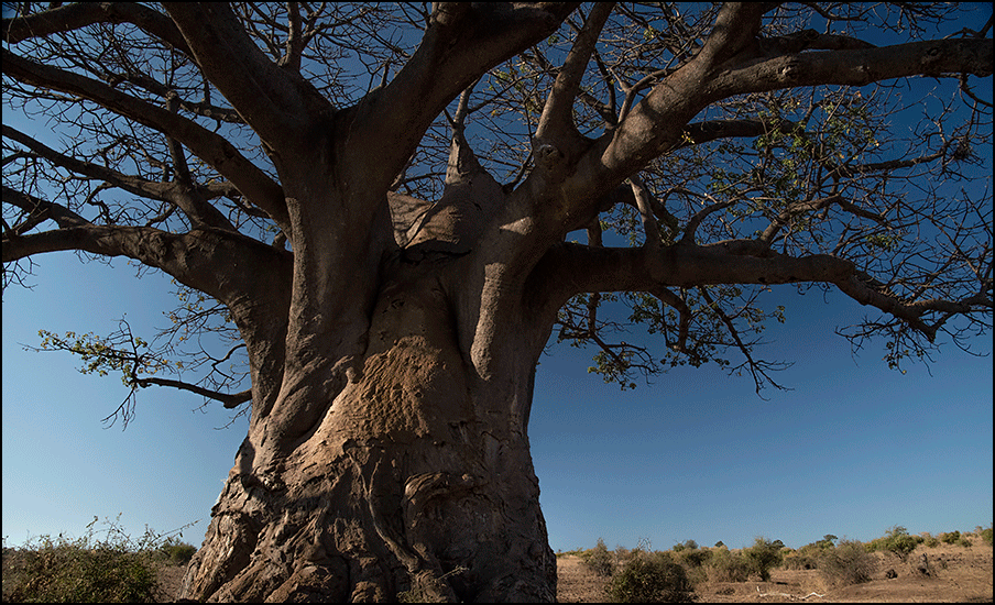 A baobab rises out of the savanna like something out of a dream.