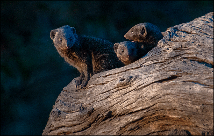 A charismatic little dwarf mongoose stood atop a fallen log, small, neat, and perfectly alert. She watched us with bright, intelligent eyes. Then a tiny head popped out of a hole beneath her… then another, and another, until her three babies had joined her. We sat quietly, delighted, as the youngsters tumbled and played, popping in and out of the crevices, full of mischief. They were utterly charming.