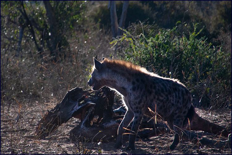 A few minutes later the mood shifted again when we made a stop at the giraffe carcass; three hyenas were there now, along with two jackals, all intent on their work. The hyenas gnawed at the bones with methodical determination, while the jackals darted in and out, snatching what they could between the larger animals’ movements. It was a little disgusting to watch, but also fascinating – nothing is wasted in the bush, and it is all part of the cycle of life.