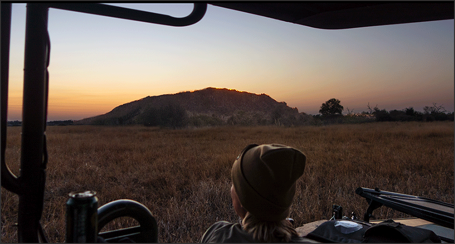 We watched the sun setting over Leopard Rock. This huge, rugged outcrop stands alone, towering over the Savuti landscape, a dramatic presence in the wide, open sweep of plain and sky. The hill has an almost magical quality to it, a place of dreams. It is a natural fortress of stone and shadow - and perfect leopard territory. And indeed, I have many happy leopard memories from this place. As the sun slipped lower, the dusky sky faded into soft pastels. Around the horizon lay that unmistakable delicate band of greyish-blue I now thought of as Savuti Skies.