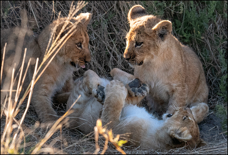Eventually the mother gave a soft call, and the cubs immediately fell into line. Together they walked up the hill and disappeared into the brush. Gee explained that she was keeping them hidden from the big males so they’d have a better chance of getting enough to eat - and also because strange males sometimes try to kill cubs that aren’t their own. Spending time with these cubs was extraordinary, one of those sightings that imprints itself on your memory.