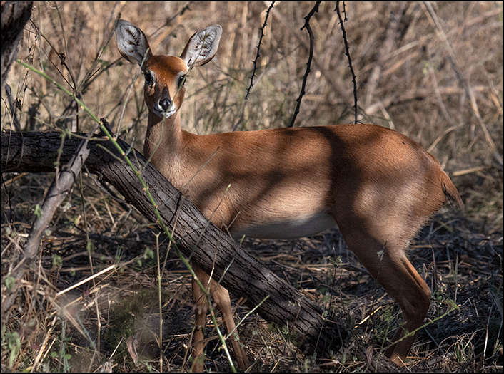 A dozen banded mongooses (mongeese?) scurried through the grass, busily hurrying from one place to another. However, two of them did pause for a moment - to mate in the middle of the road, with complete disregard for our presence. They clearly had no interest in privacy laws. A tiny steenbok watched us shyly from under a bush - a petite little antelope, scarcely larger than a newborn deer. His mate stood nearby; you almost always see them in pairs.