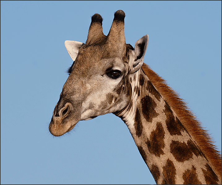Then a large female giraffe wandered up, regarding us mildly. We watched her close up, admiring her