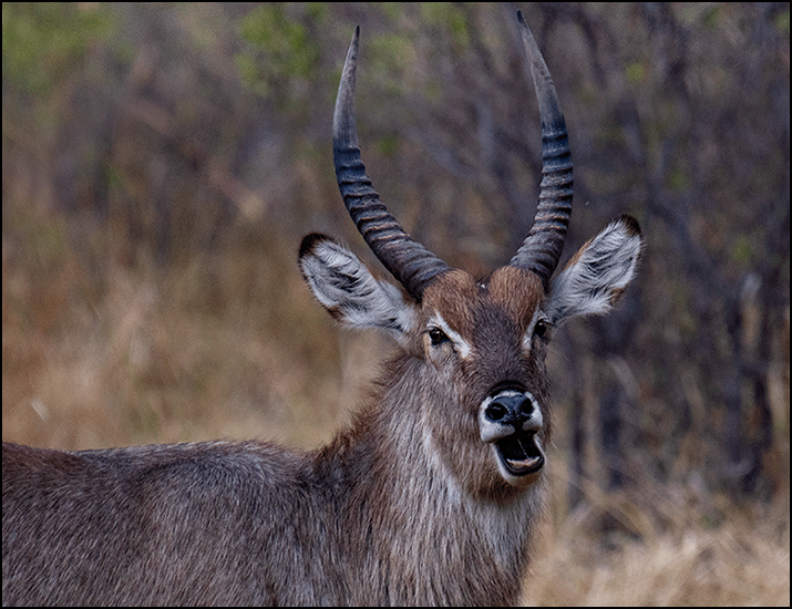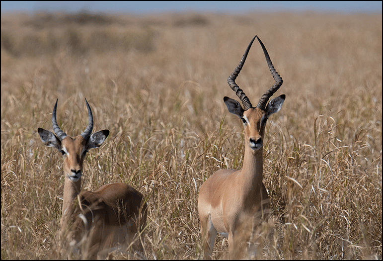 long-coated, and instantly recognizable. Their soft, fluffy brown coats and bold white rump rings stand out even at a distance. Males carry long, sweeping horns that give them a quiet, dignified presence. They live near rivers, floodplains, and marshes, and are strong swimmers, plunging into water to escape predators. Their meat is famously gamey and not considered good eating by people, but the lions, leopards, and hyenas certainly don’t complain.