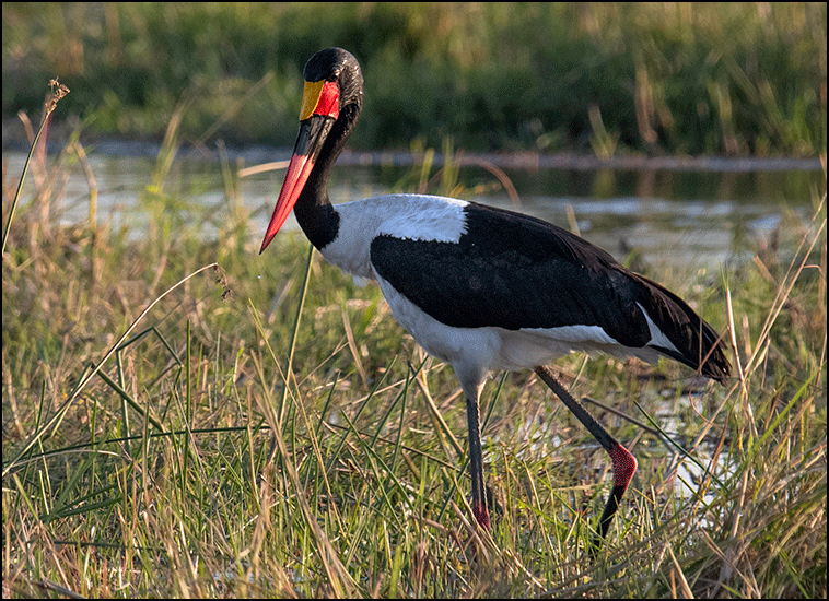 A saddle---billed stork stood tall at the water’s edge, brilliant in black and white with its boldly marked bill of red, black, and yellow. These statuesque birds are nearly five feet tall with a nine‑foot wingspan. We could tell this one was a male by his dark eyes; females have bright yellow ones.