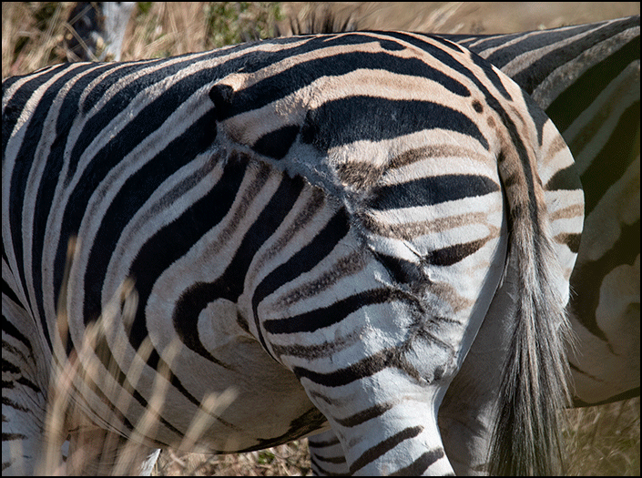 A small group of zebras grazed nearby. One mare had a horrendous jagged scar across her hindquarters - old and well healed, but clearly the result of a brutal encounter, most likely with a lion. Her stripes no longer lined up properly. She was very lucky to have survived.