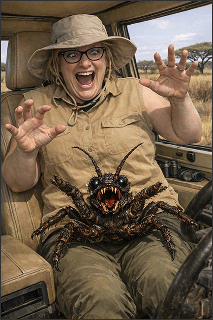 Upon returning from Africa, and after conducting a thorough review of witness statements and collaborating closely with a police sketch artist, we were able to assemble this visual reconstruction of the spider incident. Experts agree it reflects the events with unfortunate accuracy.**