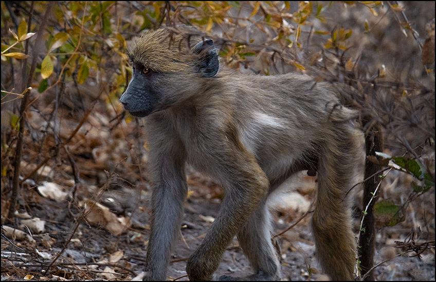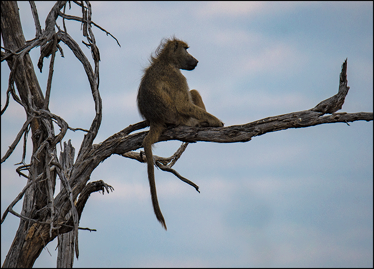 A troop of baboons came by, foraging around through the tall grass and bushes. We could see a big male sitting in a high tree, silhouetted against the sky, clearly keeping watch. As usual, the baboons didn’t quite meet our eyes as they passed close by. Some of them gave us the distinct impression that they considered us trespassers. They are fascinating to watch, but they always creep me out just a little. We heard their harsh alarm bark - Gee said that to him, it always sounds like they are shouting “John! John!” Once he said it, we couldn’t