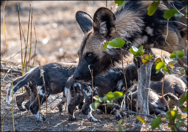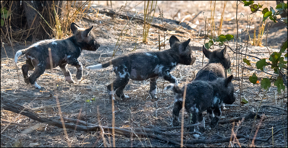 The pups moved about, exploring the little clearing. After a while they started to play quietly, climbing over one another, romping and tussling. When a big male returned to the den, all the pups - and the other adults - rushed to greet him. I love this about the dogs: every homecoming is a celebration. The entire pack helps care for the puppies. Each time another adult came back from the hunt, the pups greeted them with the same wild enthusiasm, chittering and chirping, their little tails wagging furiously. Adults returning from the hunt regurgitate meat for the pups, who consumed it eagerly, all frantic squeaks and wiggling bodies. It felt like watching pure joy in motion.