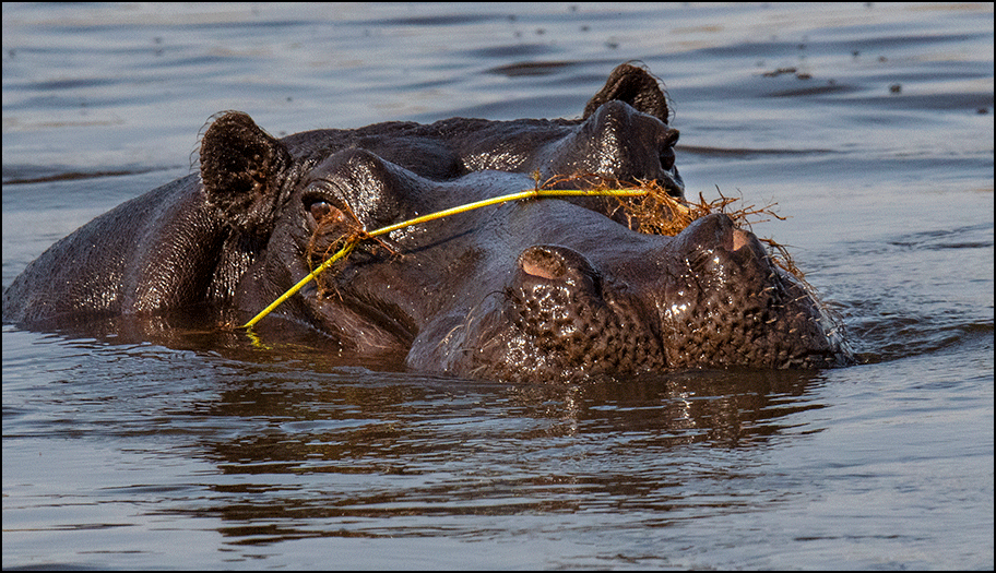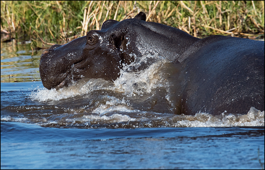 One big bull pushed up great waves of frothy water in front of him, clearly unimpressed by our presence. Then he gave a classic big yawn, opening his mouth impossibly wide to intimidate us and show off his massive teeth. Then, as if satisfied that he’d made his point, he taunted us a little - letting loose a series of loud honking chortles and belly laughs that echoed across the water. It was clear that this bull hippo throwing his weight around in the river was insisting on respect - and possibly tribute. We paid both, in the form of admiration and a very respectful distance.