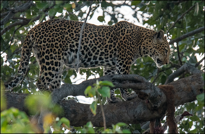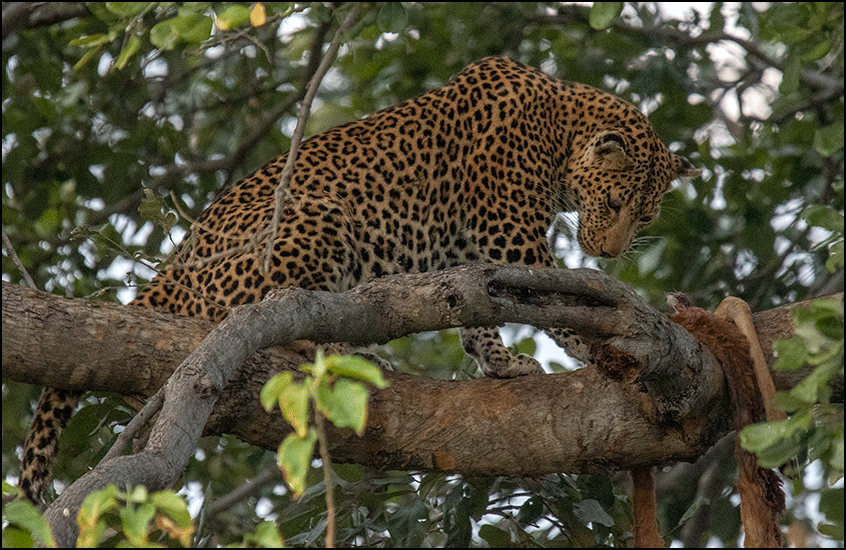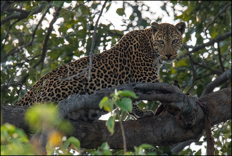 The day began with a leopard in a tree. Gee had heard about her on the radio - a big female with a young impala she had killed. We first saw her from a distance, then maneuvered around to catch a different angle. The light wasn’t ideal for photography, but we still had a clear view of her draped over the branch, powerful and self‑possessed, beginning her morning meal. She glanced down at us once, completely unbothered, then returned to eating her impala.