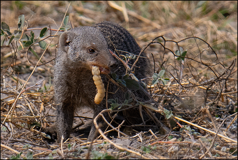 A banded mongoose was scuffling around, close to the road. He was digging with frantic, determined energy, completely absorbed in whatever he was after – then he popped up triumphantly with a fat worm in his mouth, looking quite proud of his success. He posed for us for just a moment, and then darted back into the bushes with his prize in tow.