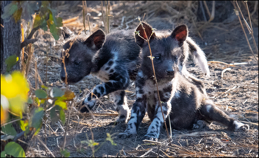 To our delight, Gee took us to the wild dog den. We arrived a little before nine o’clock, but several vehicles were already there, and at least one was not very considerate about letting everyone have a look. Still, the excitement of seeing a den made it easy to ignore the pushy driver.