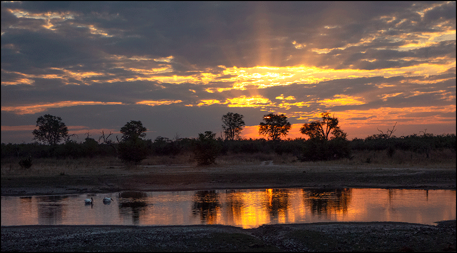 Unlike in the national parks, you are allowed to night‑drive in Khwai, so we didn’t have to rush back to camp before dark. We stopped for sundowners at a large waterhole where several pelicans were swimming around like oversized ducks. Gee served us wine and we watched a magnificent sunset - brilliant colors and dramatic clouds reflected in the still water, as the sky seemed to melt into the lagoon.