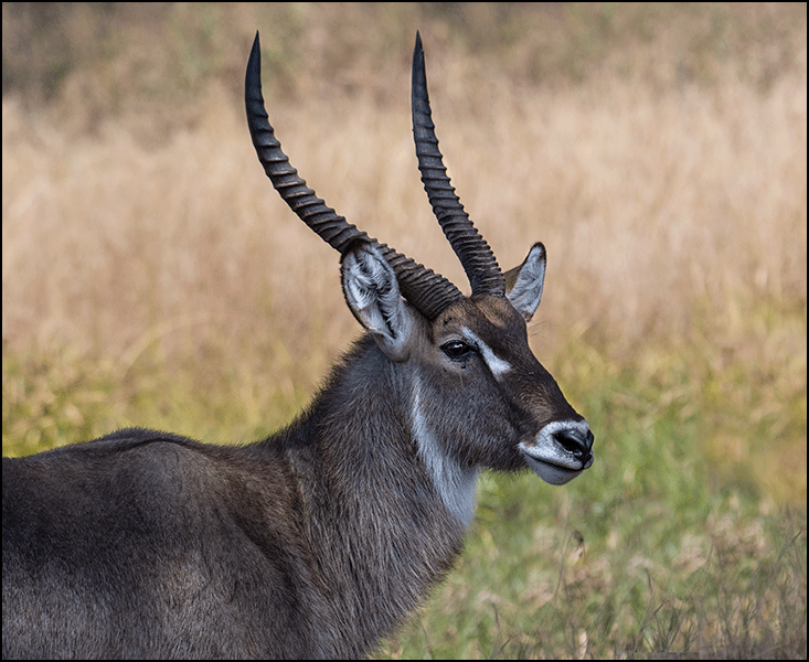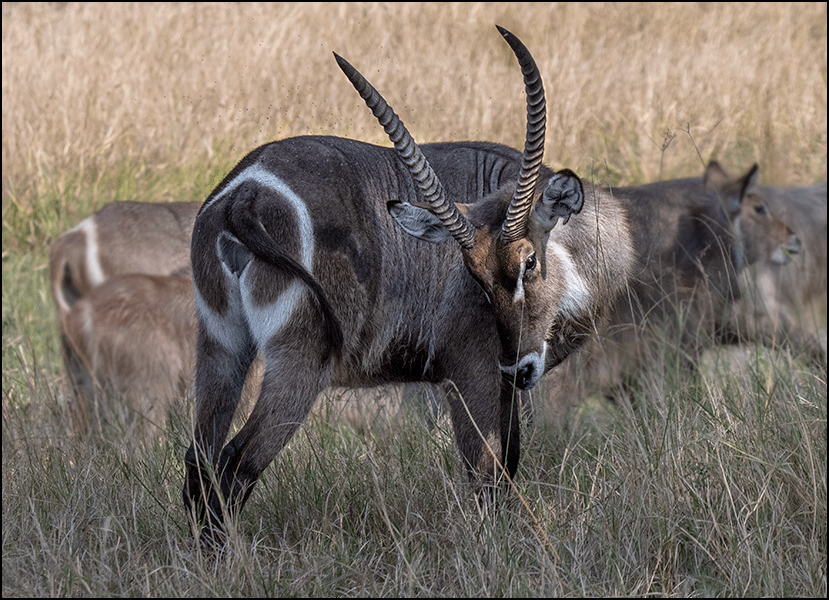 A herd of waterbucks were grazing near the water, the white targets on their rumps glowing softly in the afternoon light. With their long, wooly coats, these lovely antelopes always seem to me as if they belong in a much colder climate than Botswana.