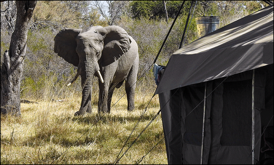Back at camp, Jineen and I were sitting on the verandah of our tent after lunch when we heard a noise behind the trees. Jineen got up to look - a big male elephant was about twenty meters away, turning a nearby tree into his own lunch. We watched his trunk snake up into the branches, and he was so close we could hear him breathing and chewing. His slow, steady exhalations sounded almost like sighs. After a while he stepped out, walked slowly across camp, and disappeared into the bushes by the kitchen.