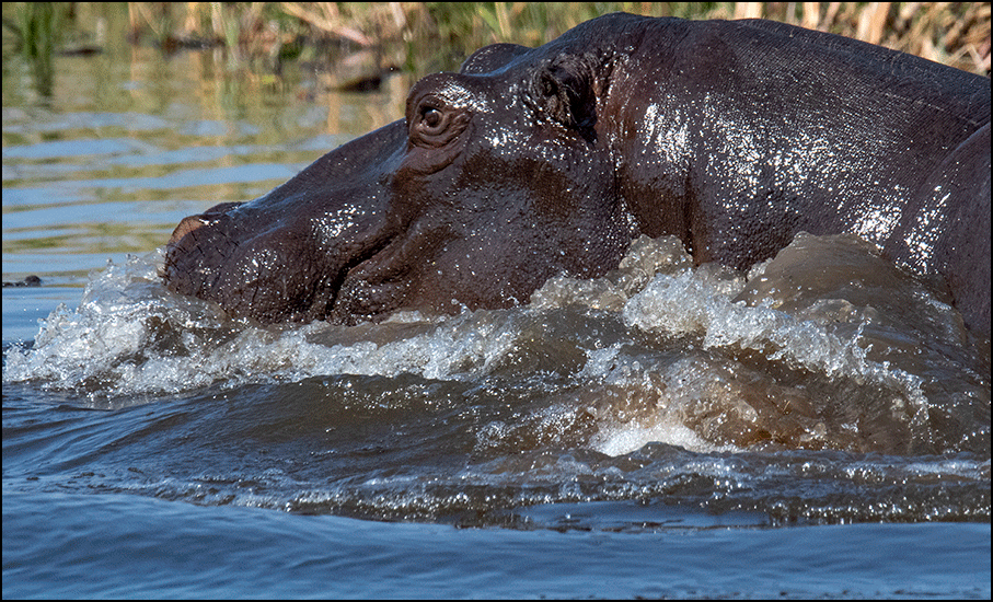 A raft of hippos - at least two dozen - clustered together in the water. Two big males were putting on a show as we arrived, plunging and splashing, pushing up great waves of water, with spray going everywhere amid deep honks and chortles. The air smelled faintly of churned mud and riverweed. The rest of the pod rested quietly, just eyes and nostrils above the surface. We could feel the vibration of their bellows across the water. It was hippo theater at its finest.