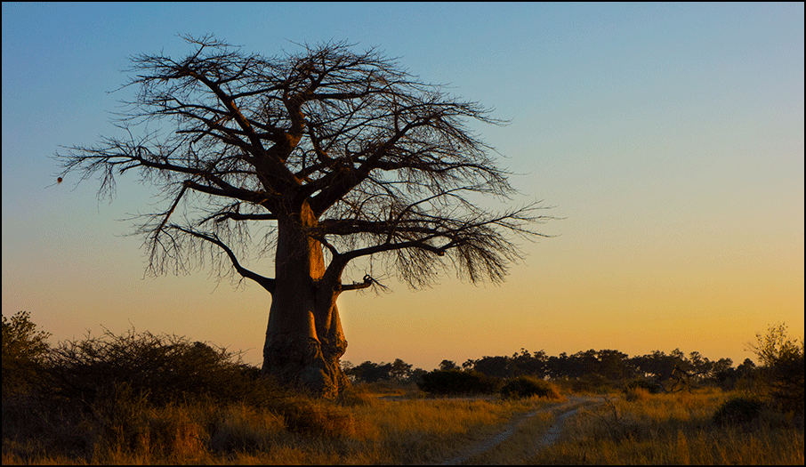 golds. A lone baobab stood like a sentinel, its dark silhouette rising against the pastel sky. The air warmed by the minute as the sky shifted through its palette. The whole landscape felt fresh and waiting.