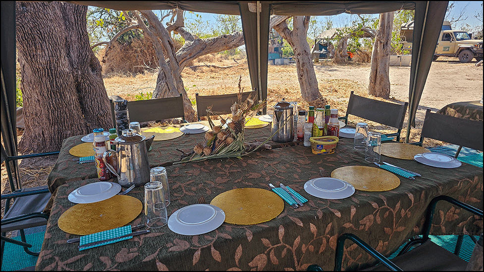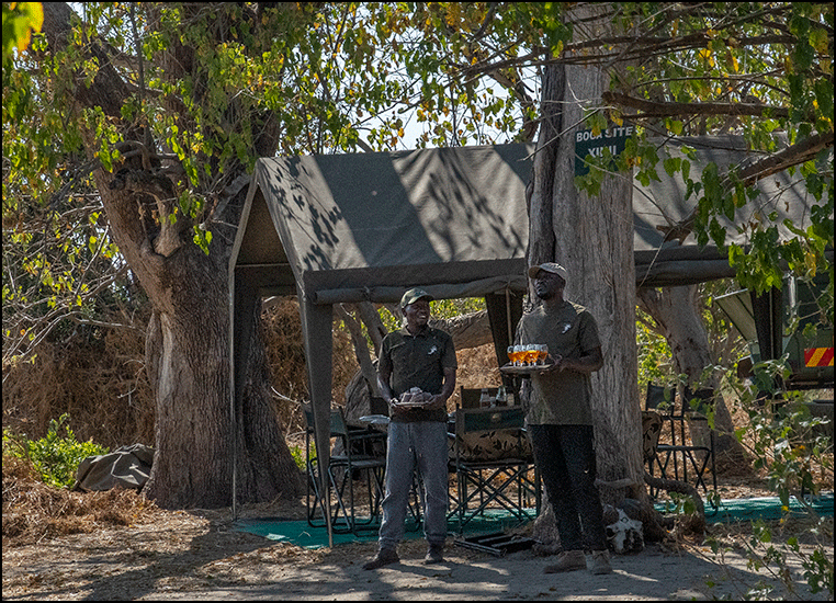We relaxed before lunch. Tree squirrels had decimated Jineen’s centerpiece, so she set about rebuilding it. We watched a lizard climbing the big tree beside the dining tent. Camp life had its own quiet rhythm, in its own way just as captivating as the drives.