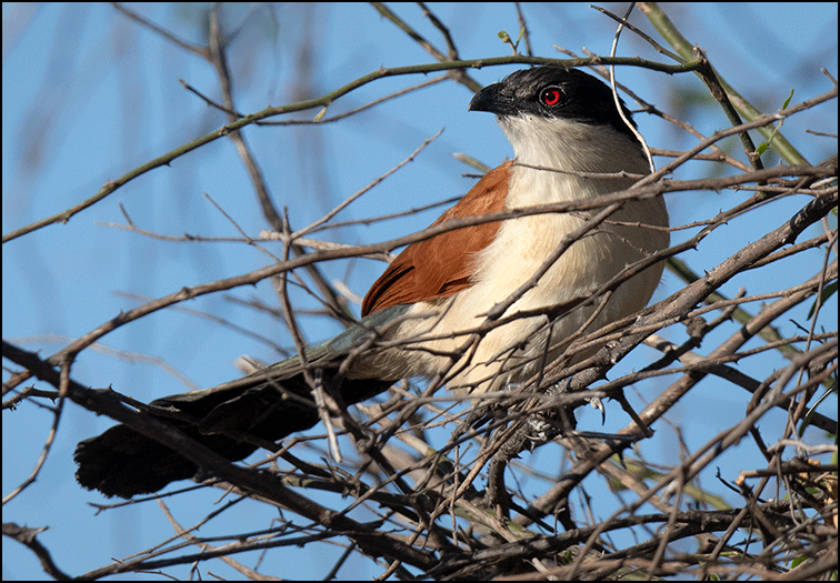 We passed a strangler fig vine that had completely overtaken its host tree, the entire green crown now belonging to the vine. A Senegal coucal perched nearby, his copper, white, and black plumage shining, bright red eyes watching us. He looked mildly offended that we’d noticed him.