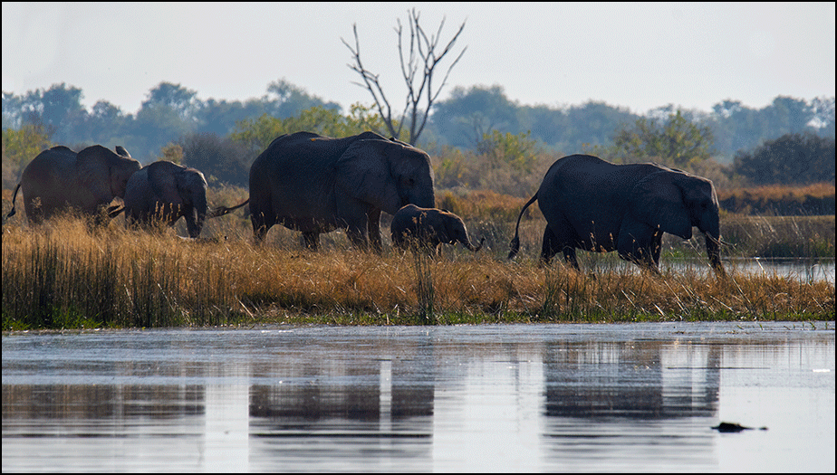 A shiny, wet hippo hurried across a spit of land, moving from one pool to another. An old bull elephant walked through the marsh, framed in a beautiful scene of reeds and water. Then suddenly there were over sixty elephants in the road ahead. We didn’t argue - we detoured. Some traffic jams are