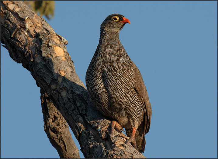 A pair of red-billed francolins perched in a tree - a rare chance to see them sitting still instead of scurrying across the road. In the good light we could appreciate how appealing they really are, like compact,