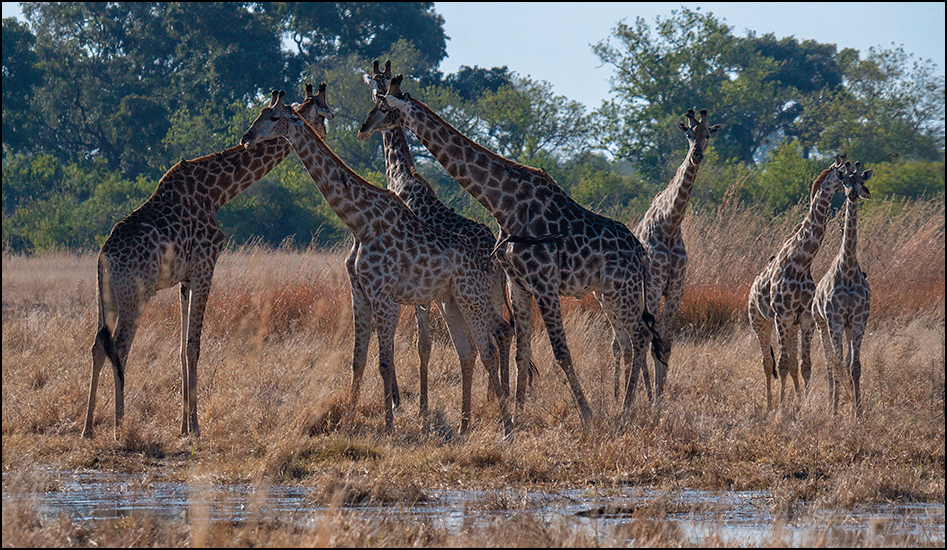 A journey of giraffes strolled gracefully through the grass. There were eight or ten of them, and they didn’t seem to mind our presence at all. We watched, mesmerized, as they moved around us in slow, choreographed arcs, crossing necks and striking graceful poses, gleaming in the sunlight. They looked exactly like those wood carvings sold in every African market: three giraffes standing in a circle, necks intertwined in perfect symmetry. It felt like watching living sculpture.