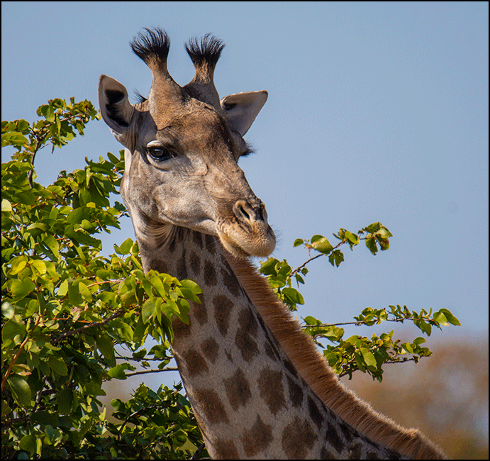 Six giraffes appeared- they watched us with mild curiosity. They allowed us to get quite close – in fact a young female wandered right up to the vehicle, browsing leaves just a few feet away, her face refined and gentle. We could hear her chewing, slow and deliberate, the soft crackle of leaves surprisingly loud at such close range. Up close she felt almost otherworldly - all long lashes and quiet grace. She gave us a long, thoughtful look, as if deciding whether we were worth noticing at all, then went right back to her lunch. It felt like a blessing, being allowed into her close circle.