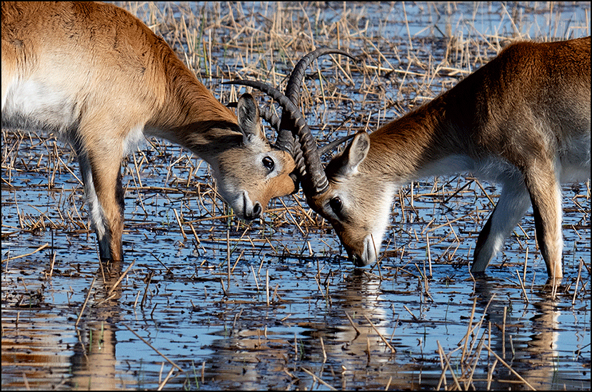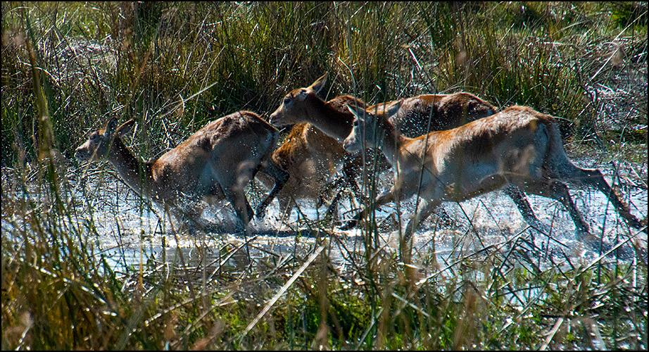 As we were ready to leave, a small group of the lechwes took off running through the water, their hindquarters kicking up higher than their shoulders as they crossed the channels, silver water droplets flying up around them, glistening in the sun. The breeze carried the splashing sound as they bounded through the water. They looked like creatures invented for this landscape - which indeed, I reckon they were.