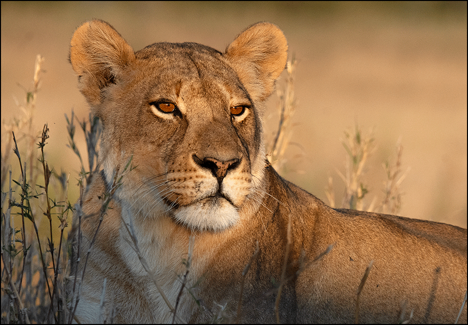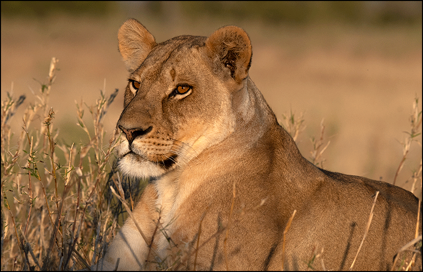 The lionesses were lean and sinewy, with not an ounce of unnecessary fat. Their muscles were sculpted, their movements efficient. They were strength and wildness personified. One seemed clearly in charge; she radiated authority without moving a muscle. She sat upright, staring across the plain intently, with dark amber eyes that looked far beyond anything we could see.